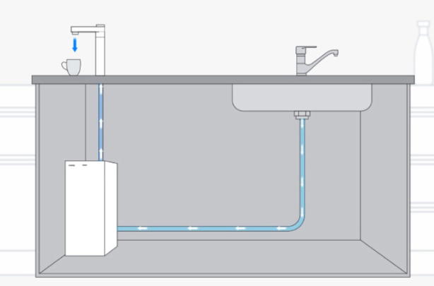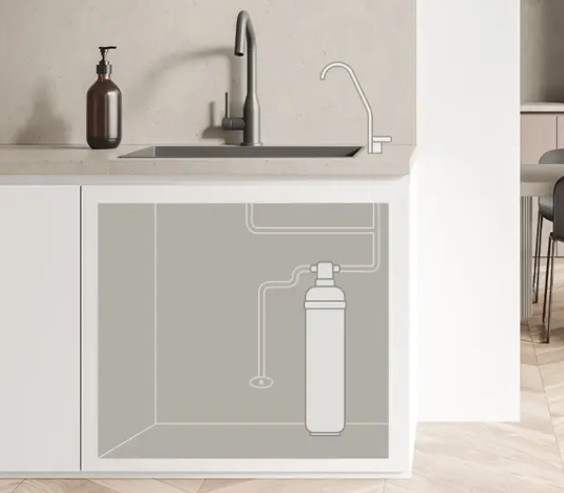 본체는 싱크대 아래에 숨기고 파우셋만 노출시켜 조리 공간이 넓어질 수 있어요.