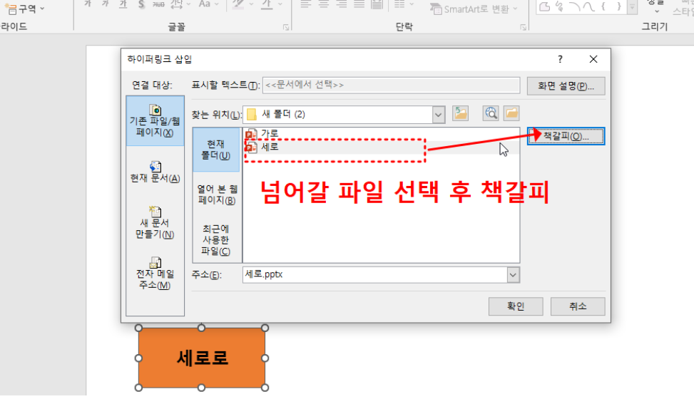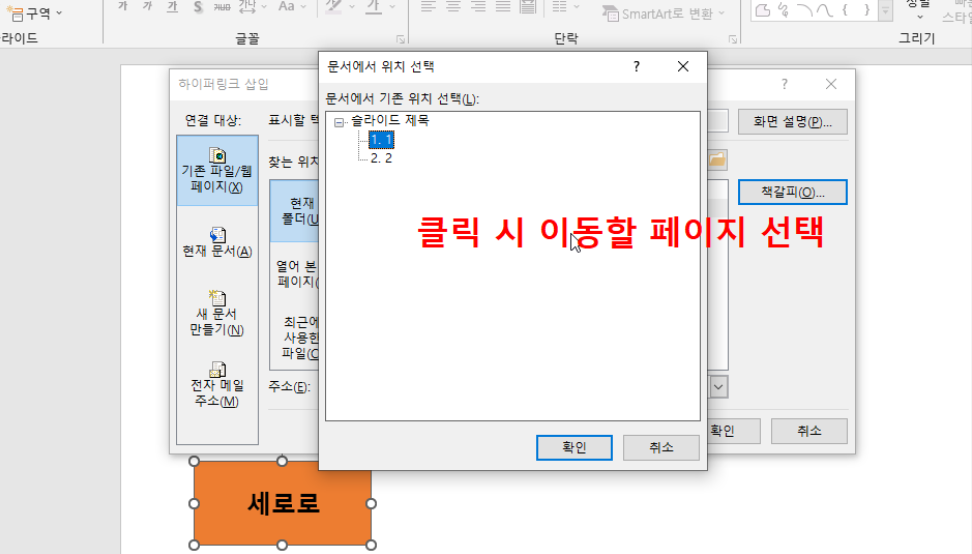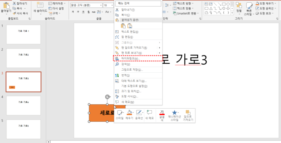 이동할 페이지에 도형 삽입 후 우클릭 → 하이퍼링크로 들어갑니다.