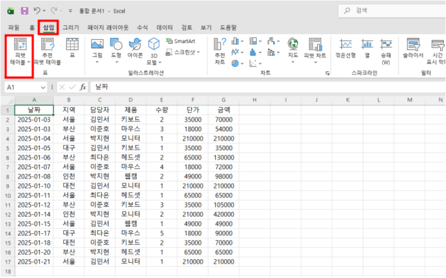 1) 상단 메뉴 [삽입] 탭 열기 → 피벗테이블 클릭