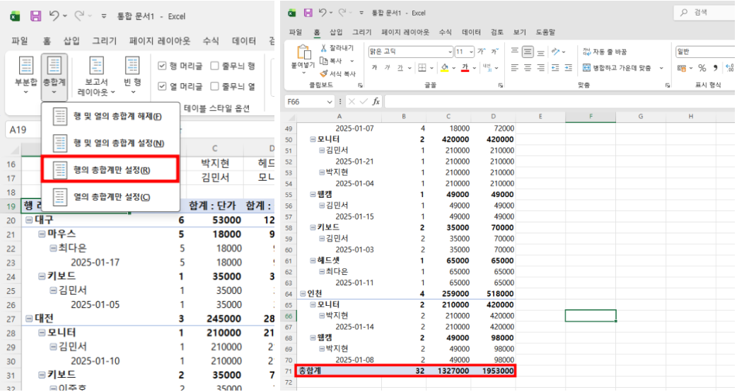 실무에서는 소계가 너무 많으면 표가 복잡해지기 때문에