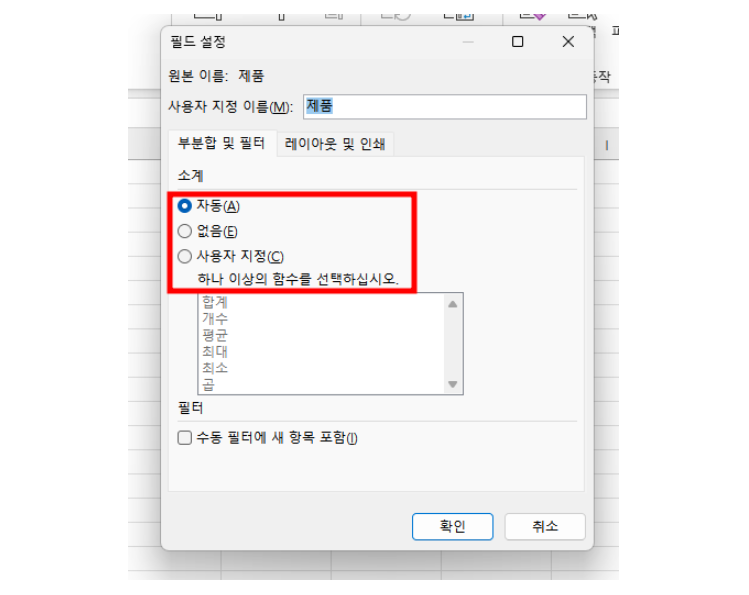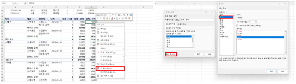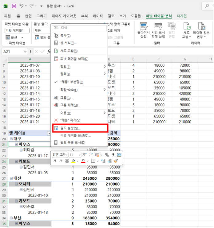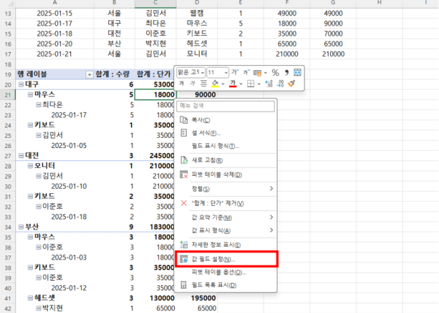 1) 행 필드에서 우클릭 → ‘필드 설정’