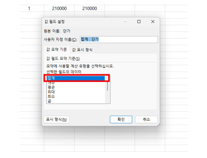 2) ‘값 요약 기준’ → 합계(SUM) 선택