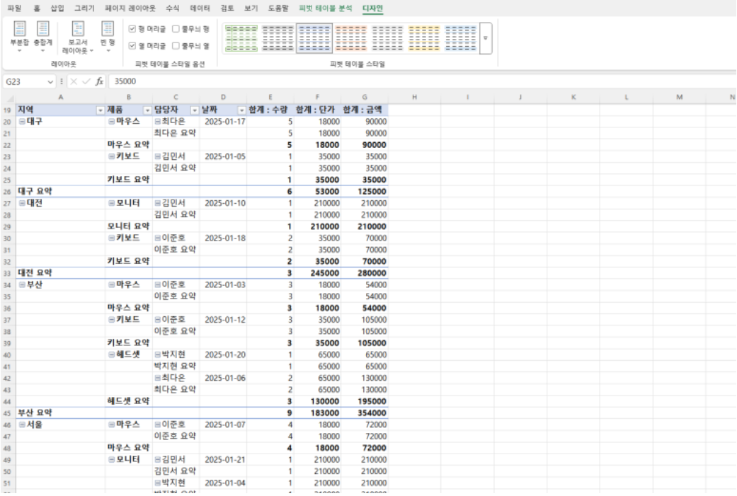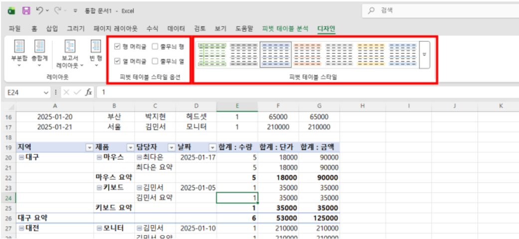 - [디자인] 탭 → 피벗 테이블 스타일 선택