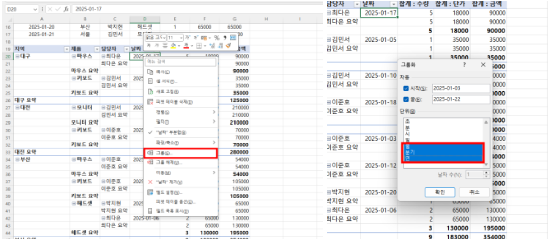 피벗테이블 합계를 월별·분기별로 나누고 싶다면