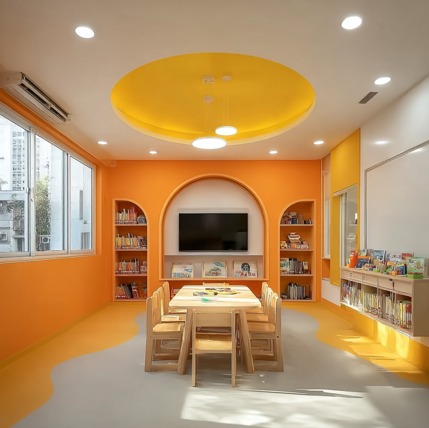 원형, 삼각형 등 기하학적 요소를 벽면에 배치하면 시각적인 자극을 주며,