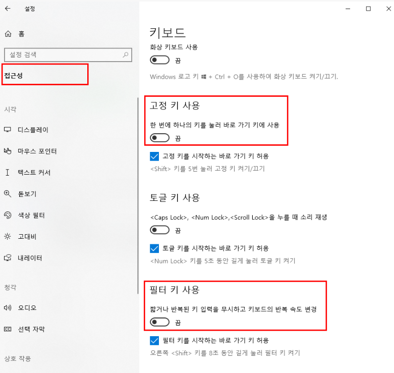 설정 > 접근성 > 키보드에서 ‘필터 키’, ‘고정 키’를 모두 꺼주세요.