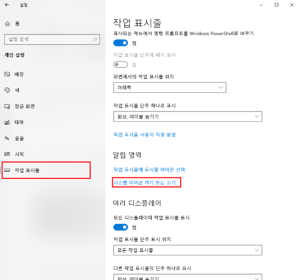 작업표시줄 표시 | 입력 표시기 아이콘 보이는지 확인 |