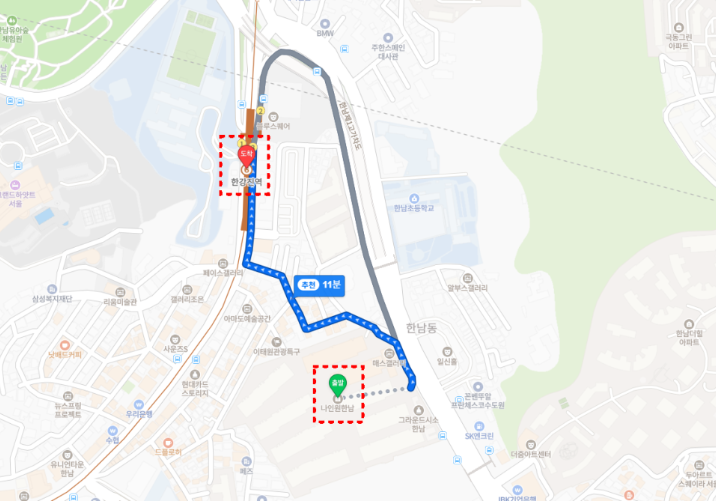 한남동 카페 거리와 고급 주거 지역 한가운데 자리해