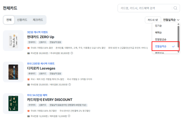 0원인 무실적 카드부터 금액별로 확인할 수 있습니다.