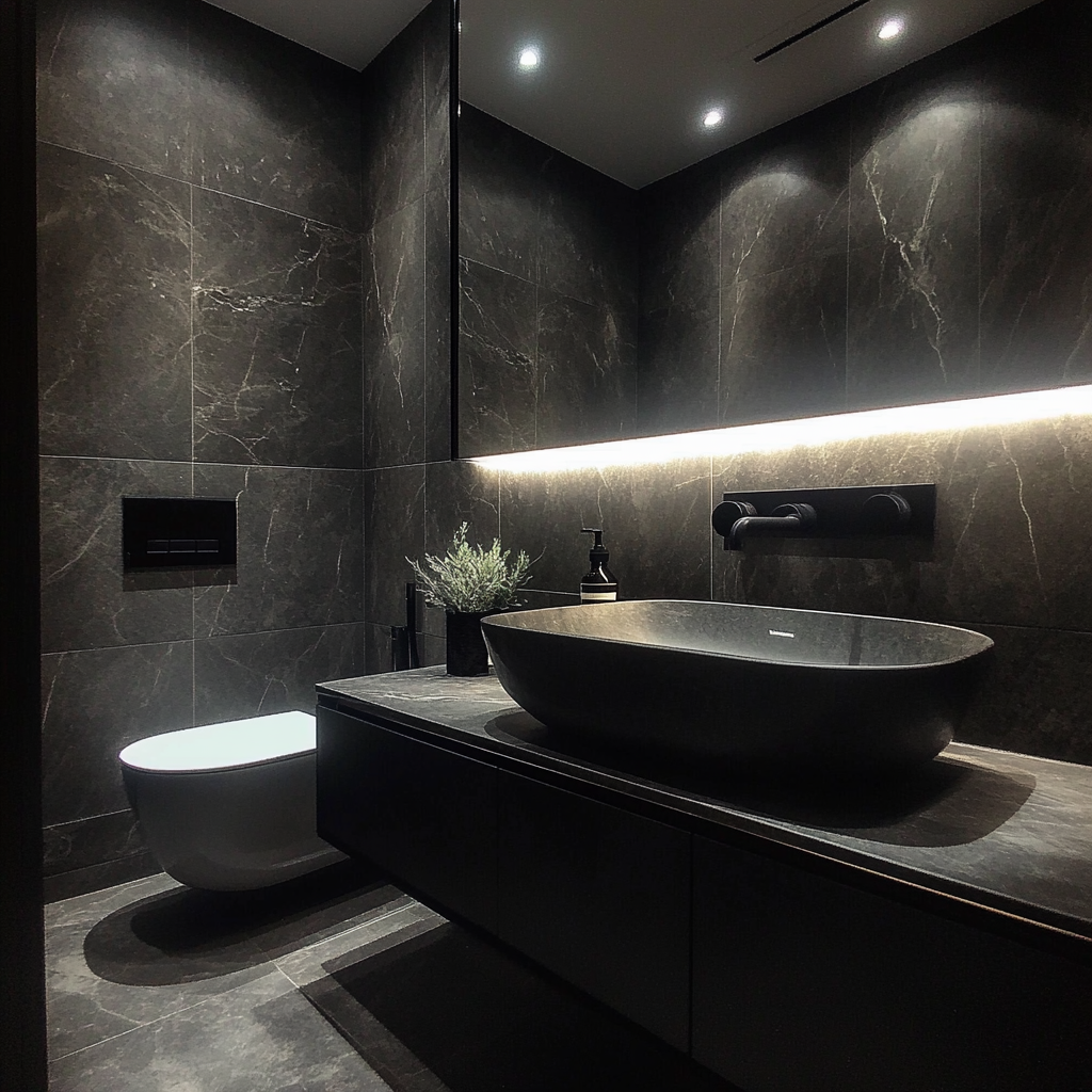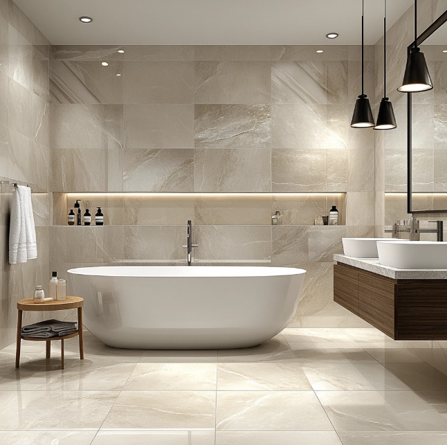 고급 타일·수전·일체형 세면대·간접조명 등