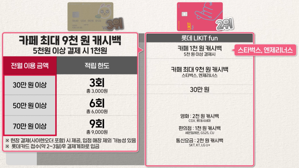 | 주요 혜택 | 카페 5% 캐시백 (1만원 이상 결제 시) | 카페 1천 원 캐시백 (5천 원 이상 결제 시) | 카페 10% 적립 |