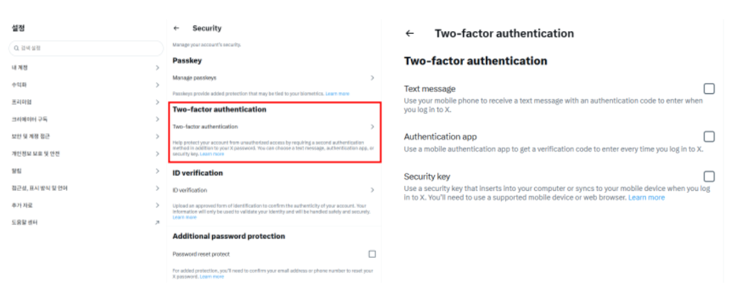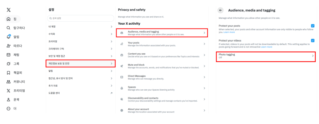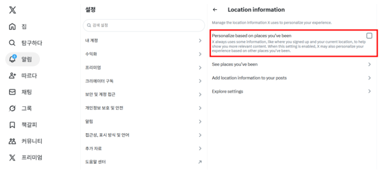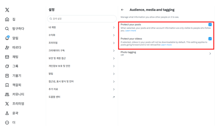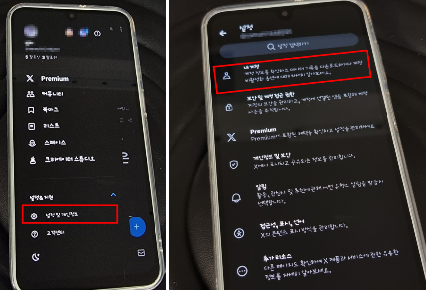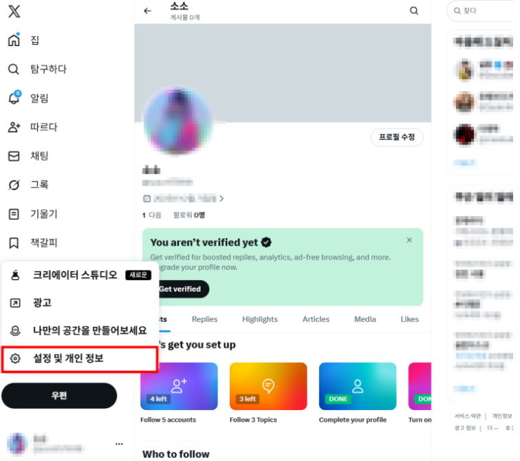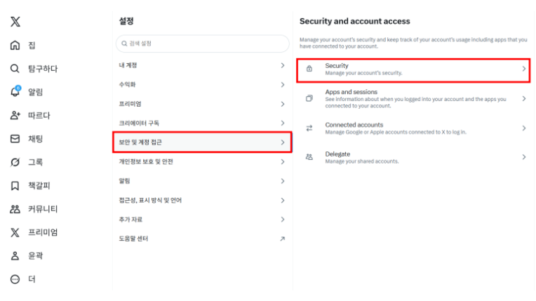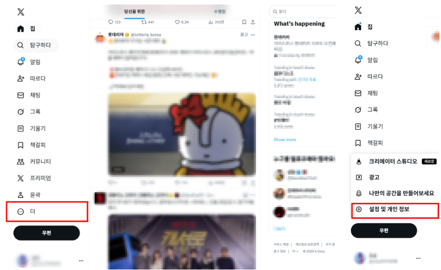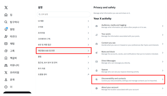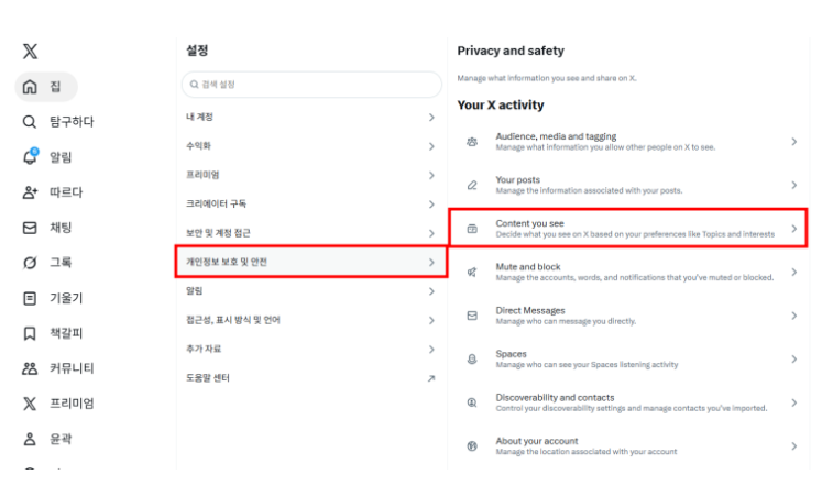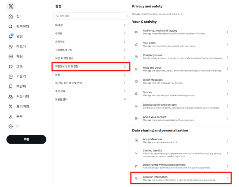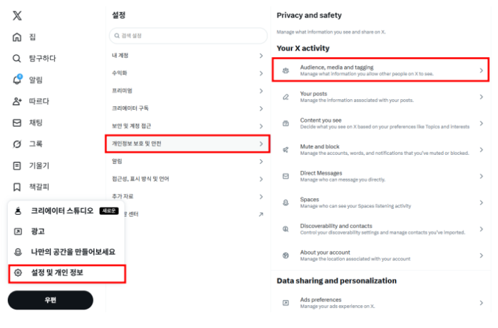 1) X 로그인 → 설정 및 개인정보