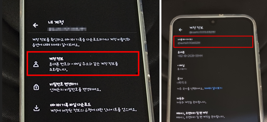 3) 계정 정보 메뉴 → 사용자 아이디 클릭
