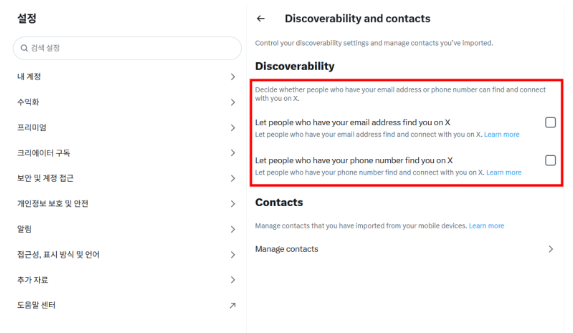 개인정보 및 안전 → 발견 가능성 및 연락처