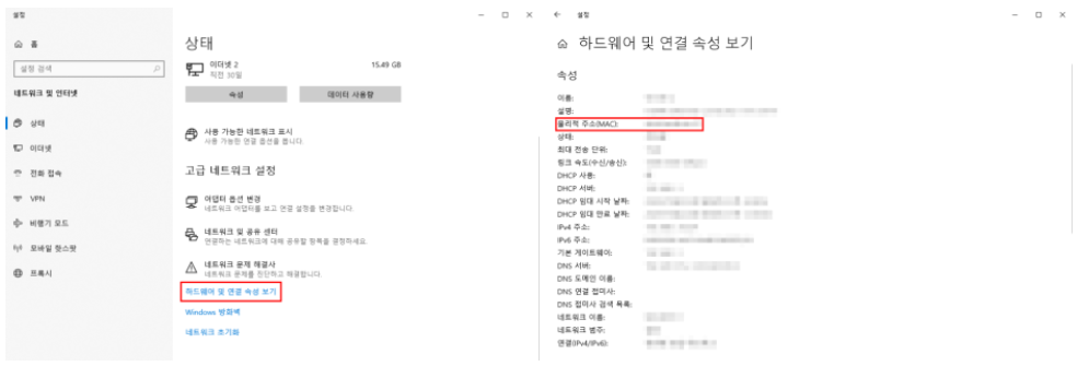 ④ 하단에 표시된 물리적 주소(MAC) 확인