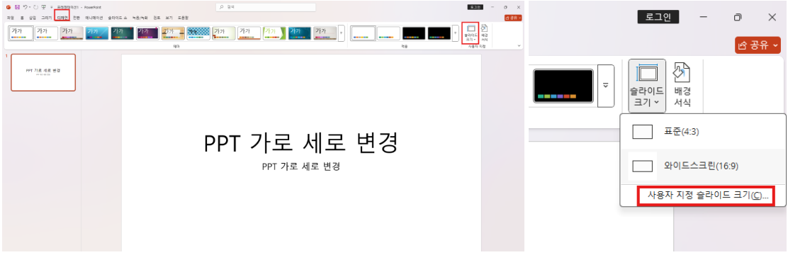 슬라이드 방향은 ‘디자인 탭’ → ‘슬라이드 크기’에서