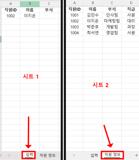 이 상태에서 다른 시트(직원 정보)로 이동한 뒤