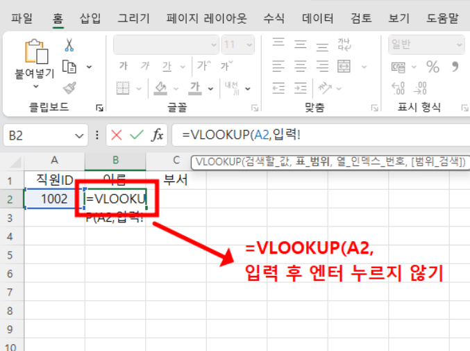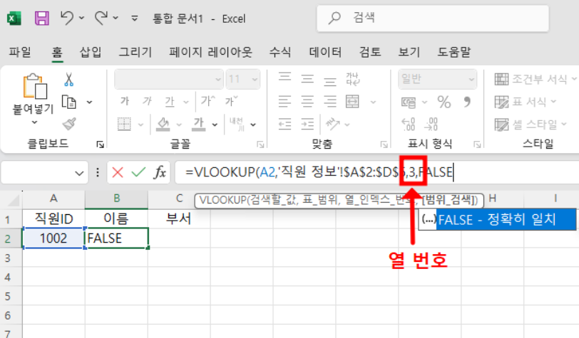 아래처럼 VLOOKUP 수식을 입력한 후,
