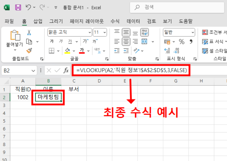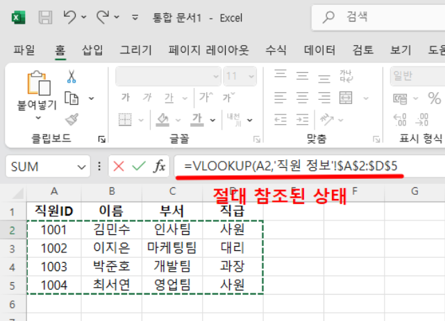 (A2, '직원 정보'!A2:D5'이 자동 입력됩니다.