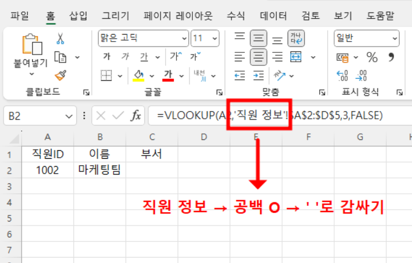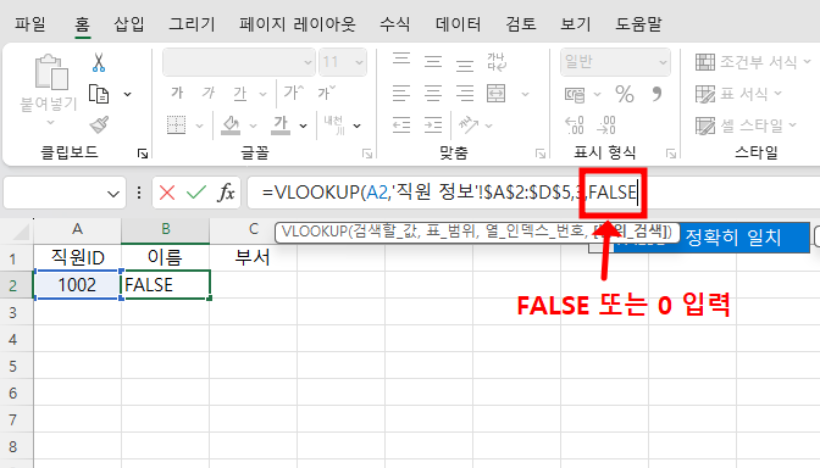 =VLOOKUP(A2, '직원 정보'!$A$2:$D$5, 2, FALSE)